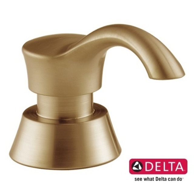 DELTA ソープディスペンサー RP100734CZ メーカー : DELTA Faucet (デルタ社) カラー : シャンパンブロンズ タイプ : ビルトインタイプ 容器:約530cc ※洗剤の詰替え目安は490cc前後 ※泡の洗剤は使用できません。 取付穴サイズ : 35mm~38mm ◆───────────────────◆ ■ビルトインタイプのソープディスペンサー ■スタイリッシュで洗練されたデザイン、キッチンやバスルームにぴったりフィットします。 ■使いやすいポンプ式で、必要な量だけを簡単に取り出せます。 ■取付が簡単で、1穴のスペースがあればすぐにご使用いただけます。 ■洗剤の入れ替えは上部を外すだけで簡単に出来ます。