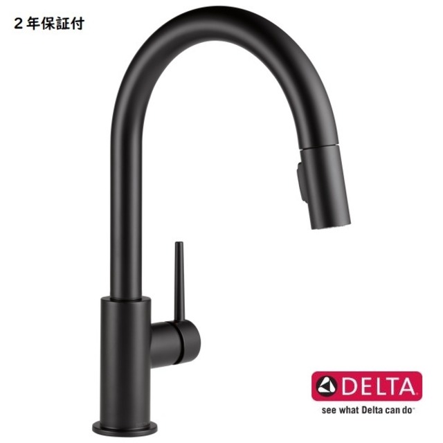 DELTA水栓 トリンシック Trinsic/9159-DST メーカー : DELTA Faucet (デルタ社) カラー : マットブラック 通水・止水方法 : レバーハンドル 吐水口高 : 214mm 吐水長 : 241mm 高さ:399mm 仕様 : 1レバー混合栓 / 1穴 または 3穴8インチ(203mm) 水栓取付穴 : 32~38mmで開口してください。 ※3穴用(8インチ)のプレートは別売りになります。 ★呼び径13mm変換アダプター同梱 ◆───────────────────◆ ■キッチン用シングルレバー混合栓。 ■シャワーヘッドは引き出しタイプでマグネットによる脱着のためスムーズです。 ■水流は空気を混ぜた泡沫水流。 ■シャワーの吐水部は柔らかな特殊シリコンで出来ている為、カルキ等の固まりを指でなぞるだけで簡単にお手入れが出来ます。 ■水栓で一番劣化の起こる制水弁をダイヤモンドを埋め込んだ強化セラミック製にし、通常の水栓の10倍以上の耐用年数を誇ります。 ●こちらの商品にはタッチ機能は付いておりません●
