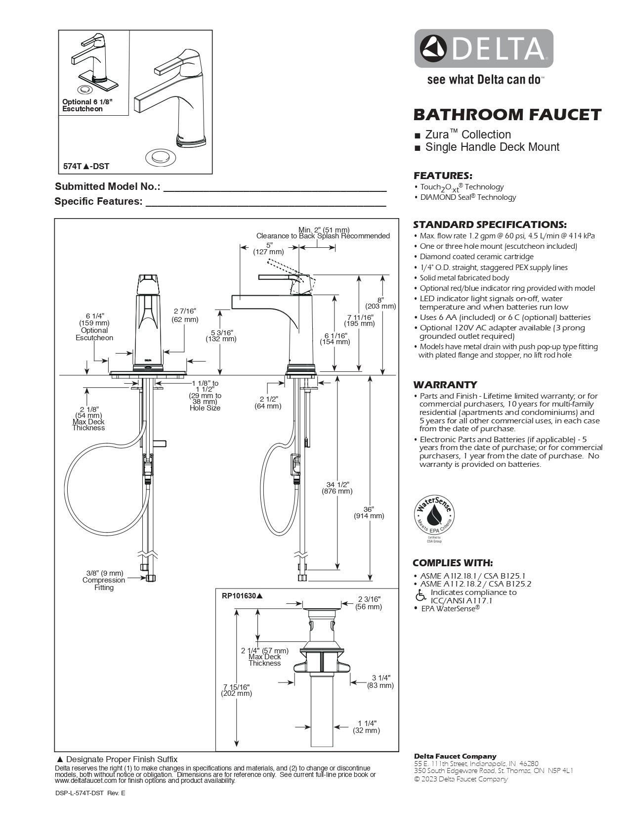 DELTA洗面用水栓 タッチアンドセンサー ズーラ Zura/574T-CS-DST