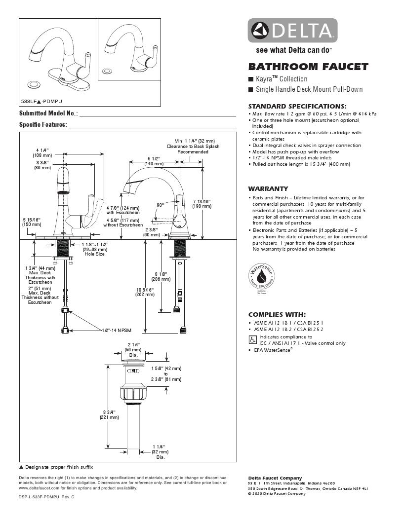 DELTA洗面用水栓 プルダウンスパウト カイラ Kayra/533LF-PDMPU