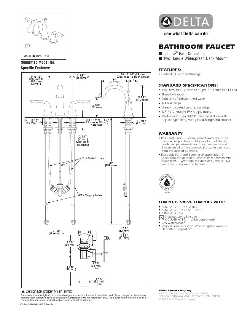 DELTA洗面用水栓 ラハラ Lahara/3538-MPU-DST