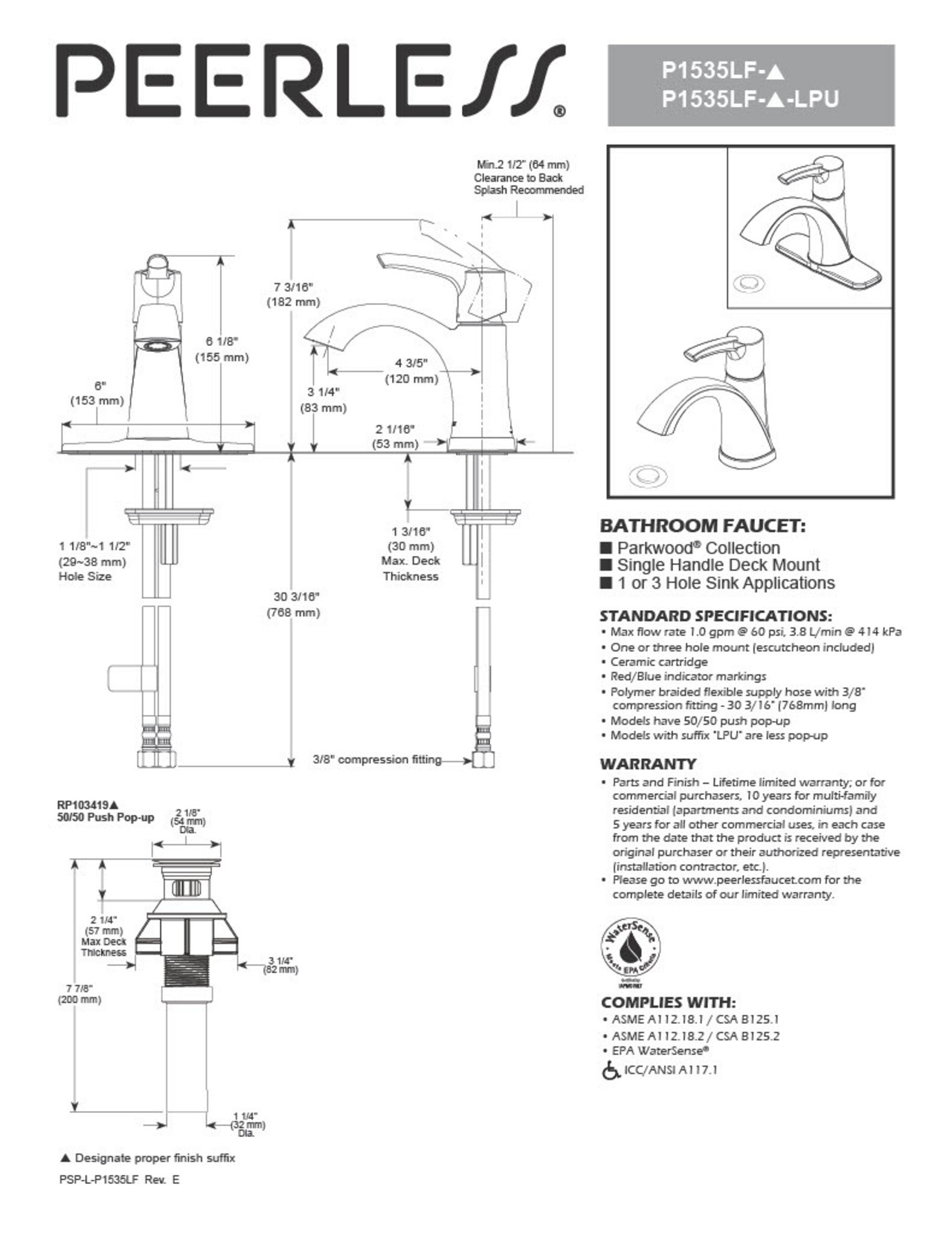 PEERLESS洗面水栓 パークウッド PARKWOOD/P1535LF-BL